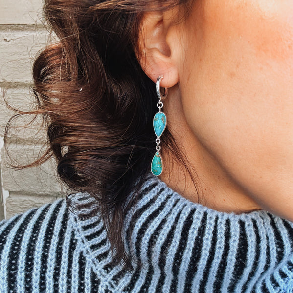 Gorgeous Campitos Turquoise is set in fine silver. The stones dangle from lightweight, hollow sterling silver huggie hoops featuring a secure hinged click-closure. These earrings measure approximately 2 inches from top of the post to the bottom stone.
