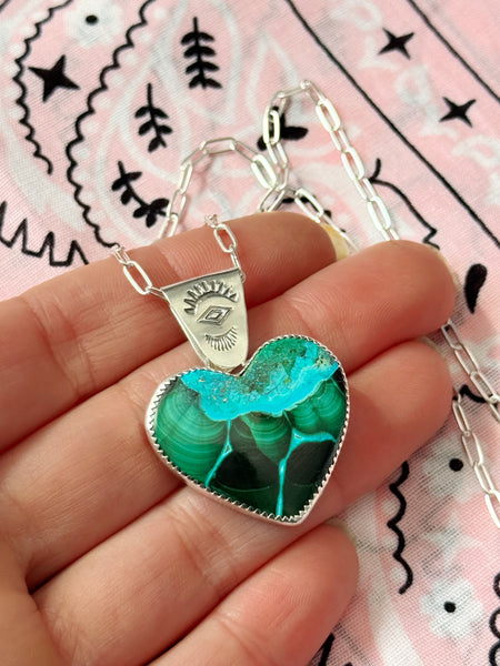 This necklace features a chrysocolla-malachite heart stone, bezel set in sterling silver and finished with a hand-stamped silver bale. The pendant hangs from an 18" sterling silver oval cable chain and is secured with a lobster clasp.