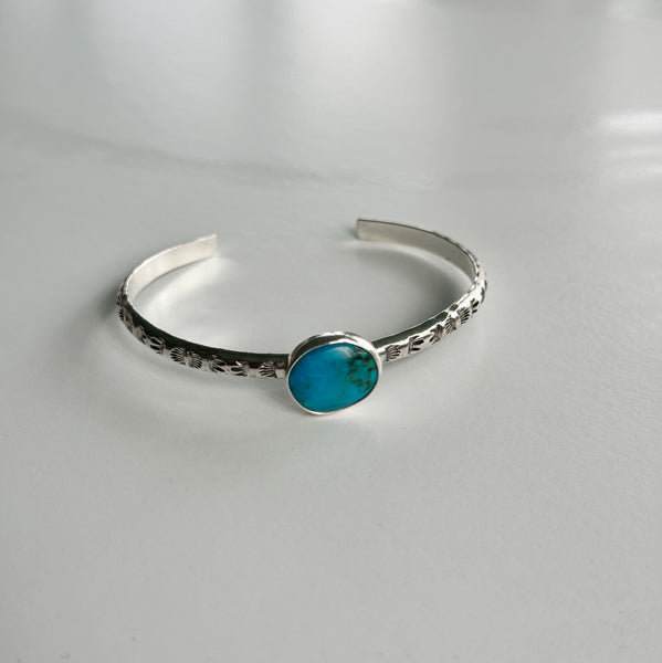 A bright blue Kingman turquoise sits at the center of this handmade sterling silver cuff, framed by hand-stamped details that add texture and character. The cuff is crafted from a solid sterling silver half-round band, oxidized and polished to a high shine for a beautiful contrast that highlights its intricate details.