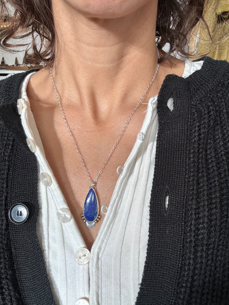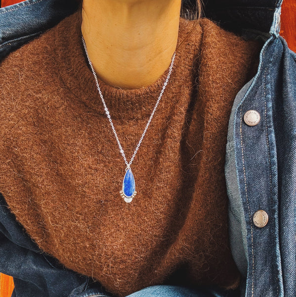A stunning blue Lapis Lazuli is framed by bronze ball details and a silver crescent moon. Hand-formed in sterling silver and bronse and finished on an 18" sterling silver chain.