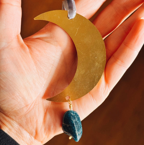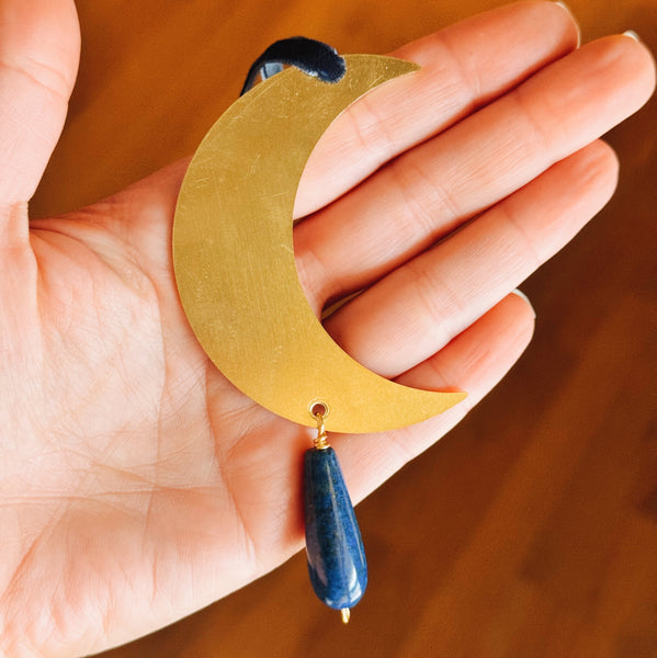 Brass crescent ornament with a gemstone drop and velvet hanging loop. Modern, celestial, and perfect for holiday décor or year-round display.