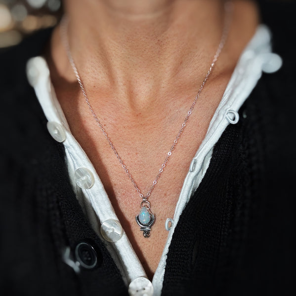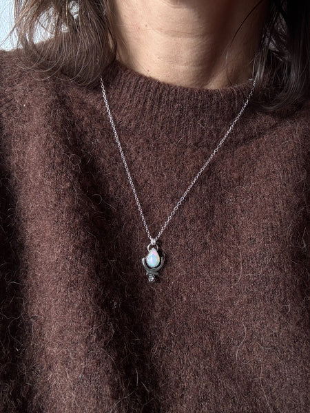 A luminous Ethiopian opal is paired with a minimal sterling silver wire form, creating a delicate sigil-like pendant that feels both symbolic and understated. Designed to sit lightly on the body, this piece balances softness and intention—an everyday talisman meant to be worn close. Hand-formed in sterling silver and finished on a dainty 18" sterling silver chain.