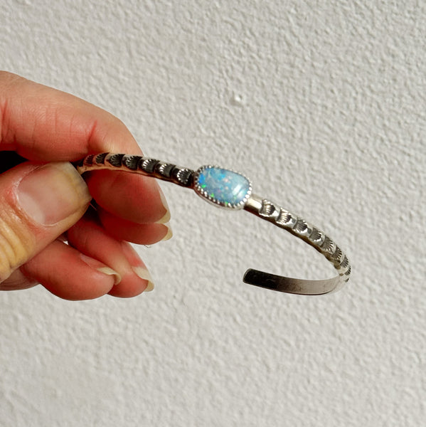 Featuring a high-grade Australian Opal doublet at its center, showcasing confetti-like flashes of rainbow hues that catch the light from every angle. Hand-stamped details adorn either side of the stone, set atop a half-round sterling silver band. The cuff has been oxidized and polished to a high shine, creating a striking contrast that highlights its handcrafted details.