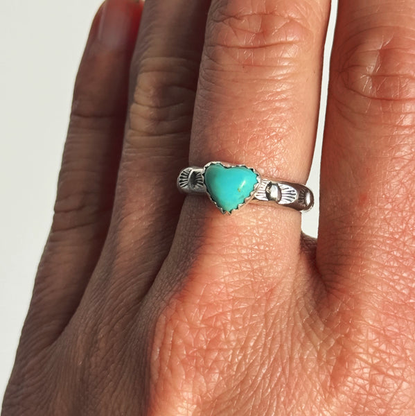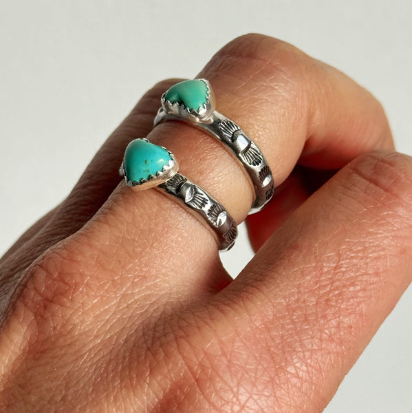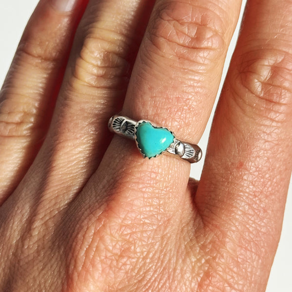 A heart-shaped turquoise stone is set atop a solid sterling silver band, hand stamped with subtle details. Each ring is made to order and hand-fabricated in sterling silver. Because every stone and stamp mark is unique, no two rings will be exactly alike.