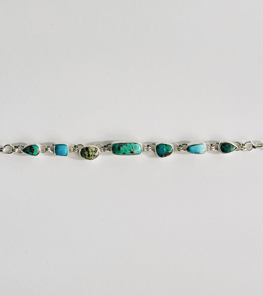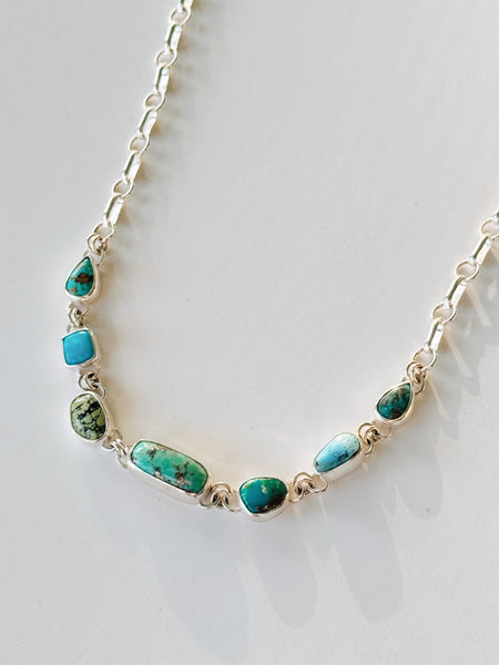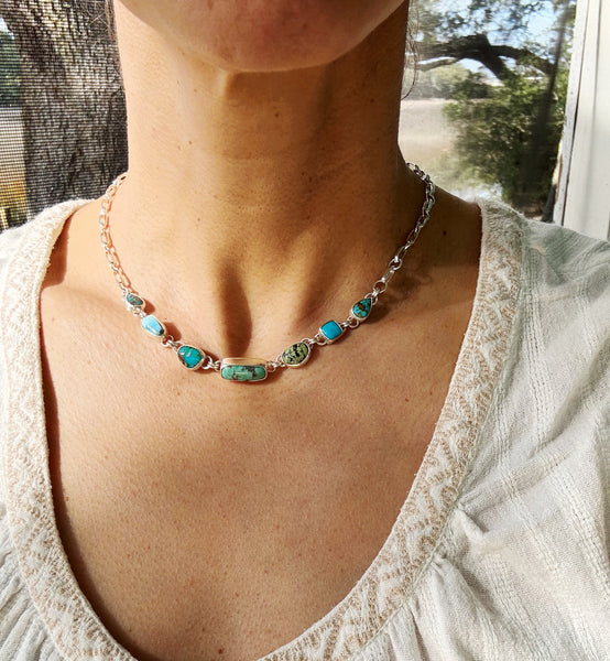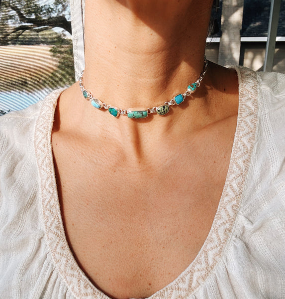 This turquoise choker celebrates the many shades of color found in natural turquoise. Each stone carries its own pattern and tone, from soft icy blues to pale ocean greens. Featuring a row of natural turquoise stones in varying shapes and varieties, each bezel set in sterling silver and linked together to create gentle movement across the neckline. Every stone has been carefully selected and set by hand, highlighting the unique colors and patterns that make turquoise such a beloved stone. The necklace is finished with a 16 inch sterling silver chain and lobster clasp, allowing it to be worn as a close-fitting choker or slightly longer necklace.